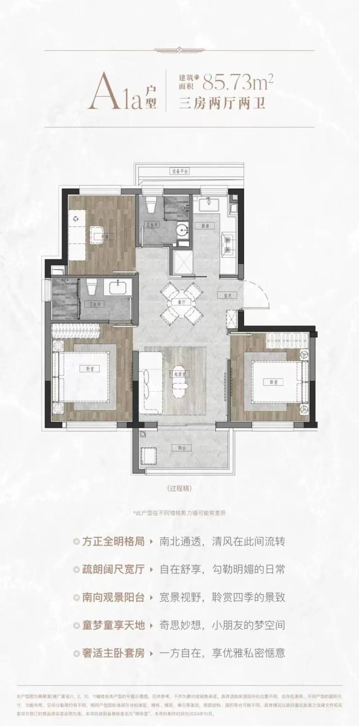 区别于市面上80多平2房或3房1卫, 该户型做出了 3房2卫 的格局,功能性拉满 ,满足三代同堂/二胎家庭共居。