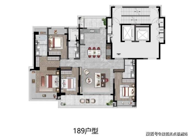 整体户型格局类似239平户型,同样的 4房2厅3卫 设计,一梯一户,私密性好。