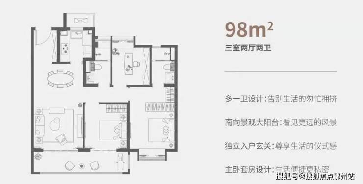 该户型多开间朝南、宽景阳台,三房两卫起步,满足刚需/刚改客群对居住尺度的要求。小户型也配备了两个卫生间,早上不用再抢卫生间啦。