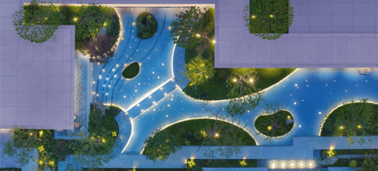 水景一侧是一段曲折幽静的星空连廊,能遮风挡雨的同时,也能提供游园般的归家体验。
