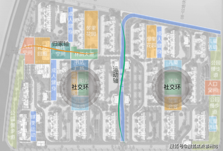运动轴-中央康养跑道,200米南北景观中轴,形成社区活力之源;社交环-社区中央会客厅,邻里花园、阳光草坪、儿童活动区、书法广场,聚合社交共融生活环;三组团-邻里花园+成人健身双组团,球类运动竞技组团。