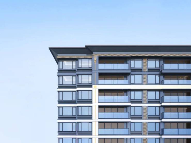 项目以门庭为礼序之始,南、北区各配置磅礴威严国风大门,为每一次回归赋予尊贵仪式感;建筑立面,三面大面积铝板+玻璃、涂料等用材,雕梁画栋国风意境,简约不失华贵;多进式归家园林,汲江南山水、历史源流、人文风物之精髓,绘就东方山水画卷。