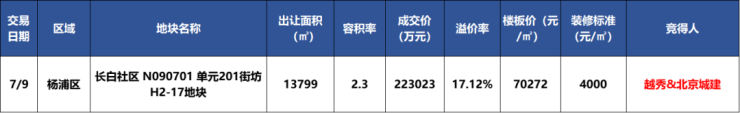 2024年7月9日,上海第三批次土拍中,北京城建与越秀地产组成的联合体以高达22.3亿元的价格成功竞得杨浦长白社区N090701单元201街坊H2-17地块(即领翠滨江),其成交的楼面价格定格在70272元/平方米,溢价率约17.12%,装修标准不低于4000元/㎡。
