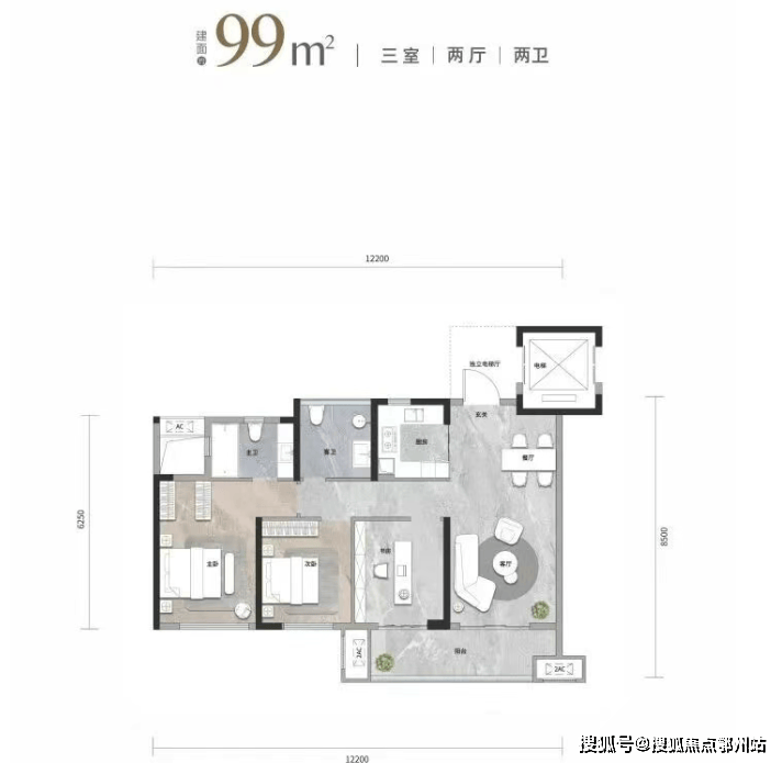 建面约99平户型,打破常规,空间布局设计优化到了极致,赋予其独立电梯厅、通透三房、双卫设计的高配置。