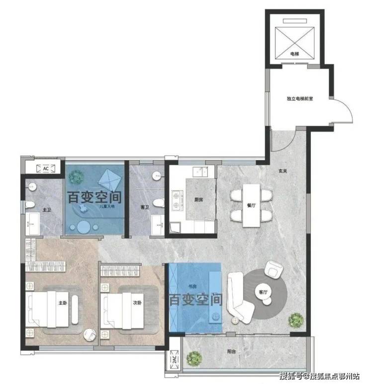 主卧对侧的百变空间,既可以做独立空间使用,也可并入到主卧,改造成主卧的小客厅或书房。
