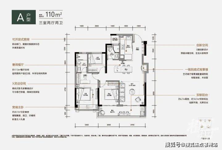 约110平方米的户型通过动静分区的设计理念确保了生活的有序,三个朝南的开间和阳台设计保证了优越的采光,每缕阳光都能照亮家中每个角落。同时,两个卫生间的设置有效解决了家庭成员早间排队的问题。