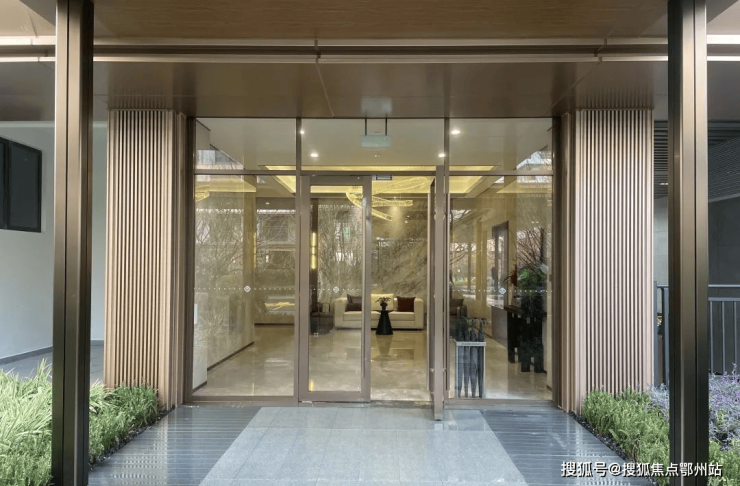 大气奢华门厅,石材地面、铝板立面。人行、车行入口物理区隔,无地面停车位,社区人车分流创造无车安全环境。