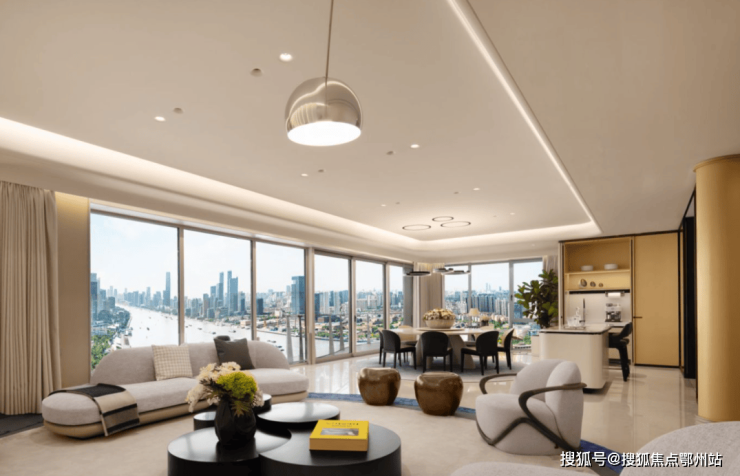 在功能空间的尺度上,整个 客餐厅面积达到了约40㎡,双面采光空间奢阔,西面直面陆家嘴三件套,还能看江! 主卧套房则拥有约30㎡大空间,足以媲美市面上建面约240㎡的产品。