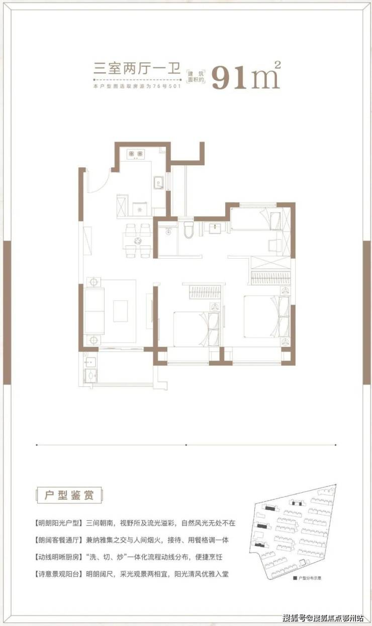 建面约 91㎡3房2厅1卫户型,做到了三开间朝南+双朝南卧室带飘窗+动静分离+卫生间干湿分离,采光面拉到极致的小3房户型。