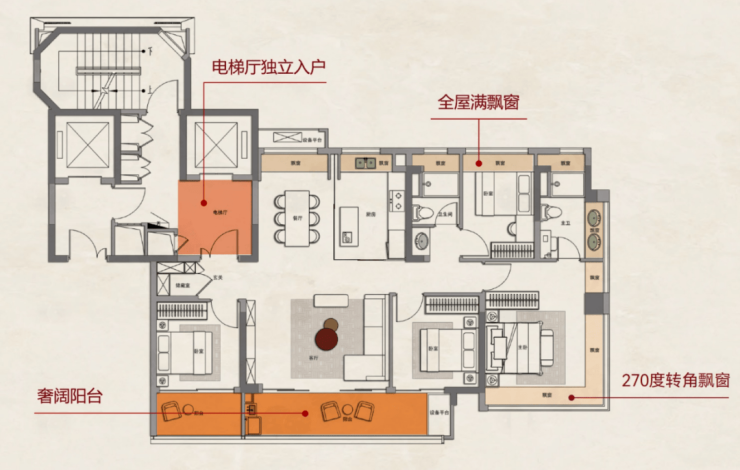 边户独有的 270°转角飘窗全景主卧套房,更是将稀缺景观资源私有化。客餐厅阳台一体化设计,让家庭互动畅通无阻。室内采用一线品牌精装交付,注重细节品质。