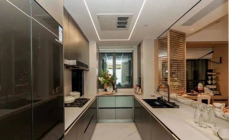 U型厨房设计,交付餐边柜。厨房配备9件套: 嘉格纳油烟机、三眼灶台;博世洗碗机、冰箱、镶嵌式直饮机、蒸烤箱一体机、保温抽;A.O.史密斯零冷水热水器;厨房也配备了日立空调。
