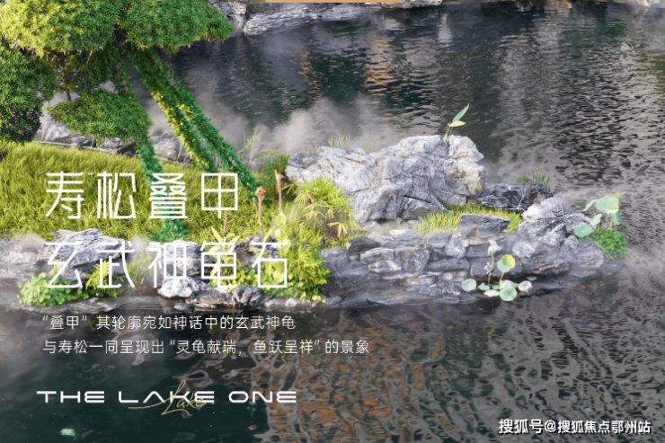 锦鲤池中心有一块轮廓如神龟的英德石,称之为“玄武神龟石”;玄武神龟石上方还有一棵全冠移植的百年罗汉松王,称为“寿松”。玄武神龟石头与寿松一同构成了“寿松叠甲”景观,呈现出 “灵龟献瑞,鱼跃呈祥” 的吉兆。