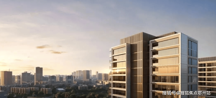 历久弥新的经典形制丨高层:底层以沉香米黄石材多重叠加,主体大面三玻两腔玻璃幕墙+仿石铝板斜切面搭配古铜色铝板内侧镶边打造大尺度油画框般经典华丽的立面,北侧搭配深灰色格栅强化立面对比效果;▲元起观潮效果图