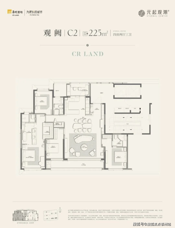 起步约225㎡户型都大宅感十足:同样是两梯两户,这个户型还配备了“ 全明电梯厅”。四房三卫的格局,南向排布三个卧室。其中,主卧不仅自带270°转角窗,还设计了 “洄游式”动线:开放式的梳妆区串联休息区和衣帽间,完成场景的无缝转换。