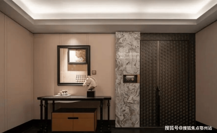 建面约270㎡五房 南厅户型:有边厅和南厅两款:两梯两户+双开门贯通电梯,实际使用起来有近似“两梯一户”居住体验。巨大的电梯厅面积将近13㎡,精装奢石和木纹铝板。从尺度到装标,都冠绝杭州住宅领域。