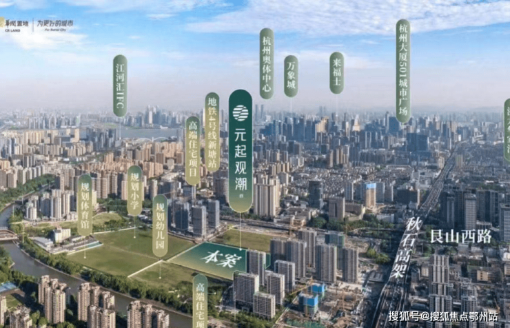 杭州华润置地·元起观潮择址城市精粹之上——上城区安琪儿板块,毗邻杭州第一中心武林和第二中心钱新,北近京杭运河,土地价值高,环境优美,交通便利,是杭州新城核心组成部分。项目所在大区域为城市核心区,周边路网发达,城市界面较好,场地周边已规划幼儿园及小学,配套齐全,地块北侧200M为京杭运河,为场地赋能。