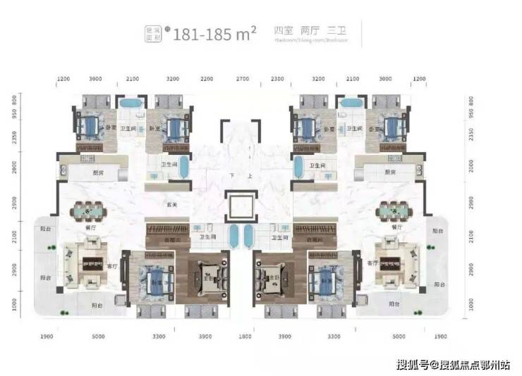 平层还有 建面约213㎡/225㎡三室三厅三卫、 约185㎡/220㎡四室两厅三卫,皆为豪宅尺度。