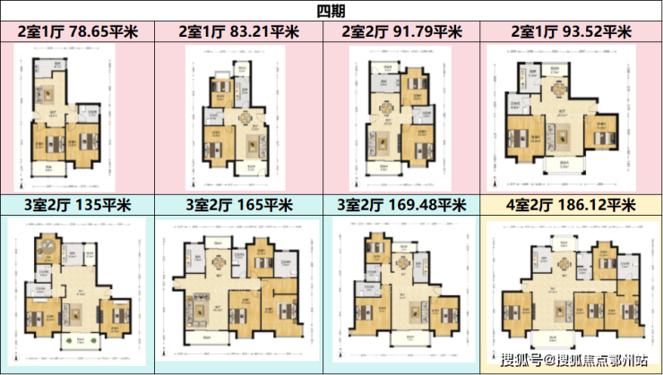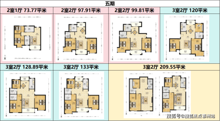 户型方面,区别也不是很大,除了一期有2种1室1厅户型,二-五期都是2室起步,三室到四室不等。多层小高的户型都非常方正,功能空间分布合理,南北通透,采光通风俱佳。还有部分跃层户型。
