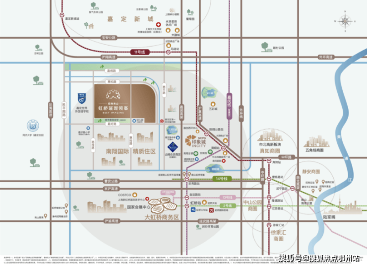 整个南翔板块区位优势明显: 距虹桥核心区直线距离约13KM,享受大虹桥强势能级辐射。同时承接虹桥国际开放枢纽北向拓展带重要节点,一脉虹桥发展金线,南翔进阶大虹桥主城生活区,成为中央商务配套区和高品质国际化社区目的地。