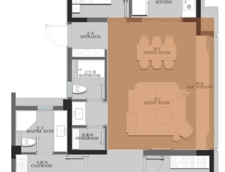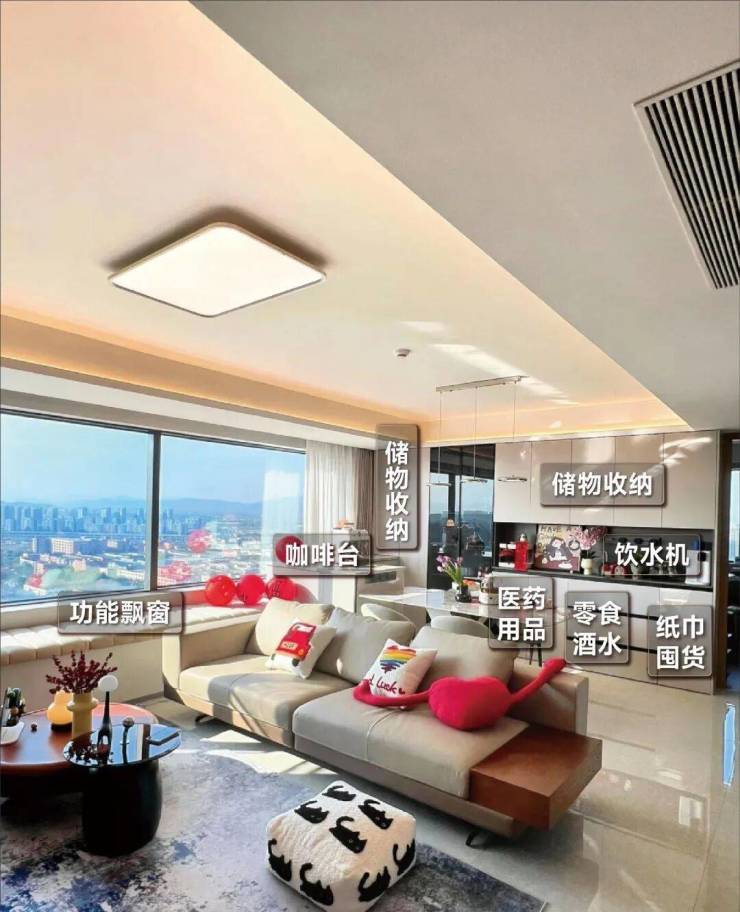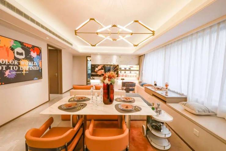 锦上云澜121㎡ 采用LDKG餐客厅一体设计 ,预留餐边柜空间,酒类、家电类、证书荣誉类奖品均可陈列于此; 边上长约6米的阔厅飘窗,承载着业主对美好新生活的各种期待 :当窗外雨落,你想煮茶赏雨,它可以是你的品茗一角;当日光柔和,你想看书,它也可以是你遨游书海的天地……千变万化,决策都由你的心思所掌控。