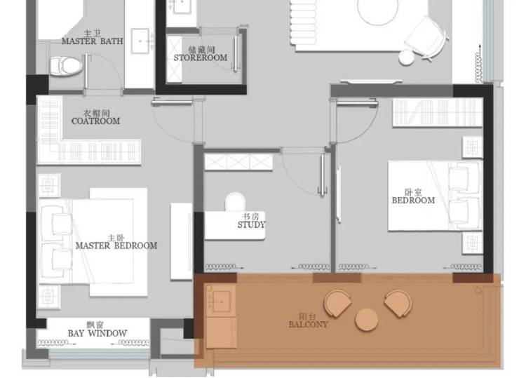 当主卧以外的空间被家人占用时,主人往往退居主卧享受其私人空间。 酒店式套房空间,将南向飘窗纳入室内,整体面积约24㎡的私人场域,可以轻松放置一个独立的L型转角衣柜收纳空间, 衣物可以按照季节、材质、颜色等维度进行分类,充分彰显主人品味,还可打造多功能化妆台+衣柜+MINI吧