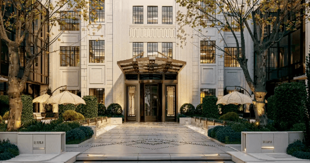 以两轴为脉络,串联起2个酒店式归家入口 ,其中南侧入口结合保留风貌建筑,以风貌庭院式设计,打造兼具历史底蕴与人文温度的归心之旅。