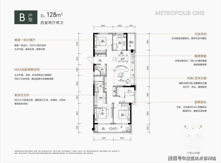 约128平方米的户型提供了宽敞舒适的居住体验。其四房边套设计不仅优雅且实用,餐客厅一体化布局配合飘窗,不只拓宽了视野,还为家庭聚会创造了理想空间。在此,无论是家庭成员间的互动还是与朋友的欢聚,都格外温馨和谐。