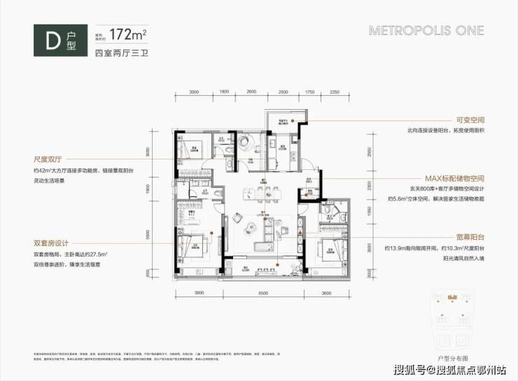 约172平方米的户型体现了生活的极致表达,其配备宽敞的大厅和跑道式阳台,四开间朝南和双套房的豪华设置使其在同类户型中突出。特别是厨房靠近客厅一侧的餐厅布局,使厨房成为家庭生活和社交的中心。