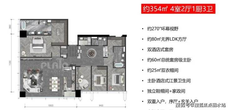 约60-80㎡无界LDK方厅丨约58-60㎡总统套房级主卧丨约20-25㎡超女王大衣帽间