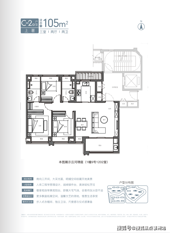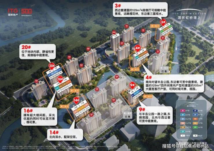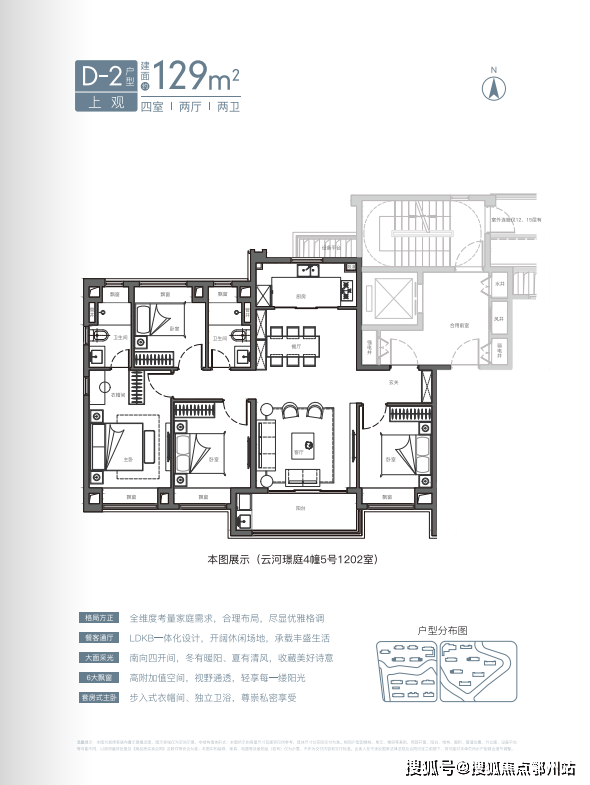 云河璟庭4#南向对望半岛公园,东边套可赏中庭景观;建面约129㎡四开间南向户型和建面约105㎡大面宽客厅户型,可同时观河景、揽园。