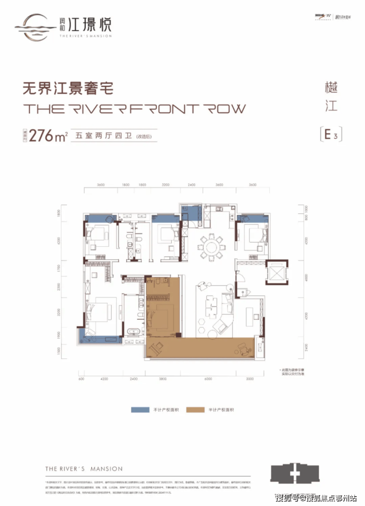 约24米观江面、5开间朝南、长达12.8米的景观大阳台、LKDG一体化的超大客厅、四套房六室设计,整体使用率接近110%,足以媲美市面上320+的户型。