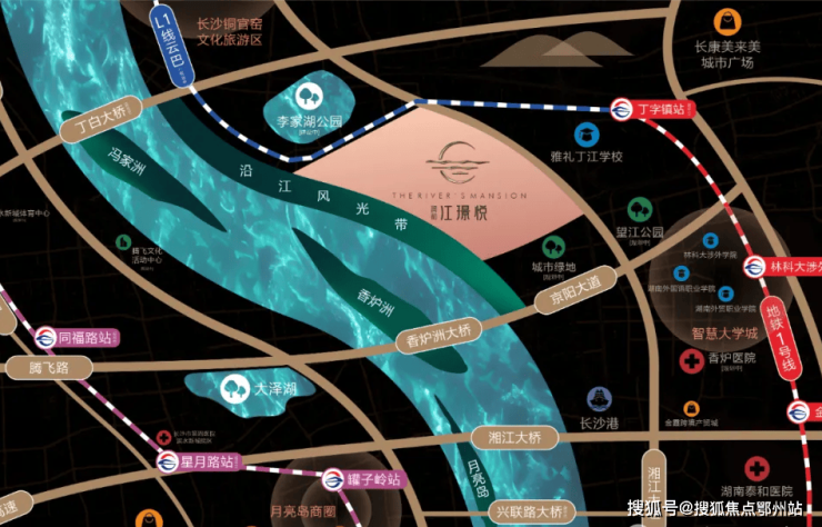 湘江在整个长沙境内共流淌了约70公里,唯独在月亮岛之后向西拐了个小弯,在香炉洲北侧形成了一个特别的湾区,全长沙唯一可以朝南瞰江的土地。