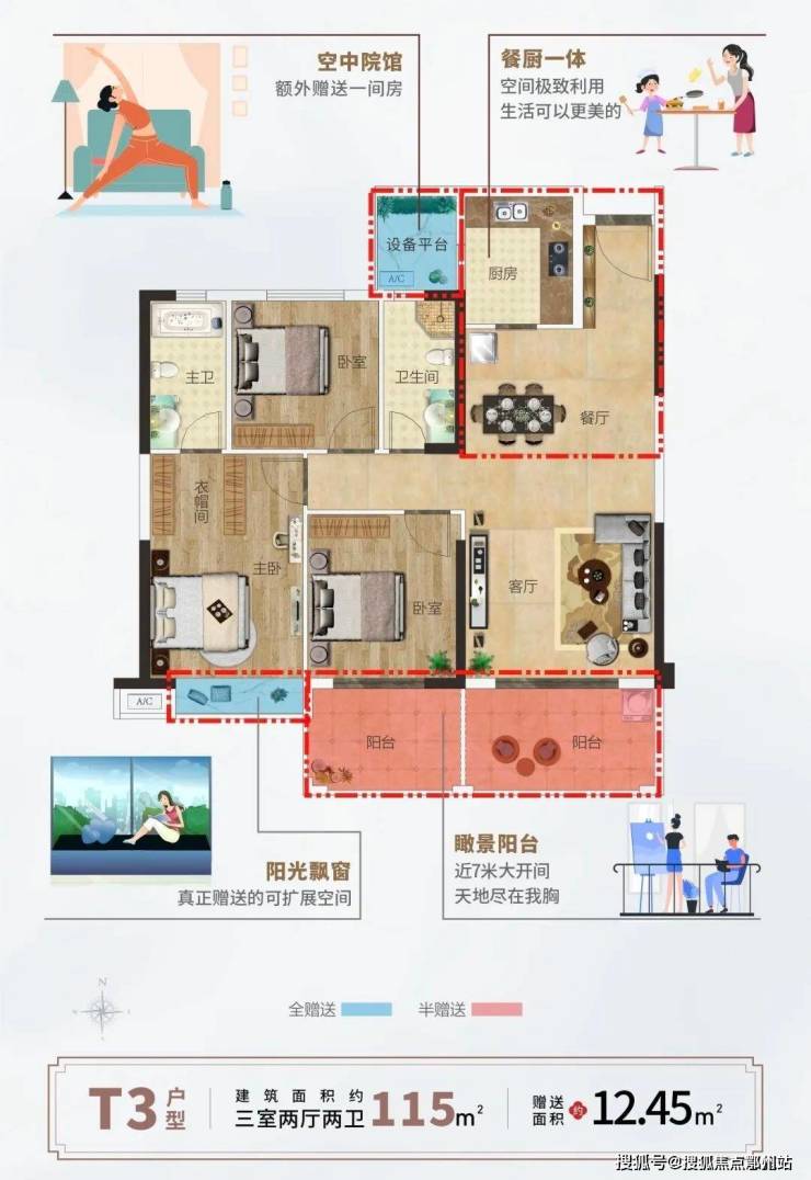 此户型采用 南北三阳台的设计,配置明确分区,生活、景观同时兼顾。