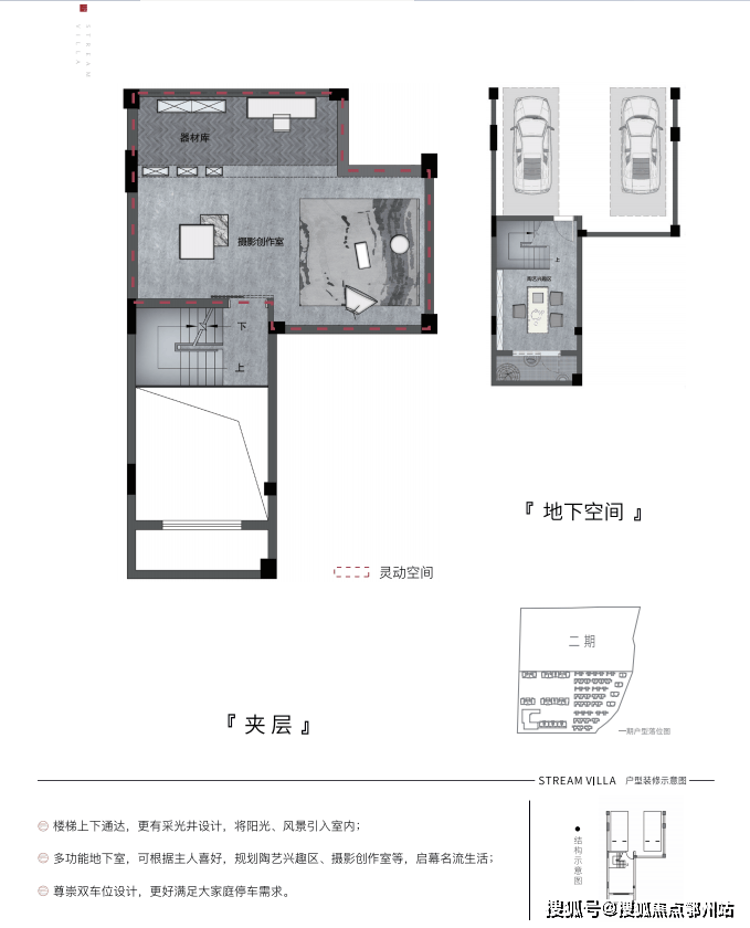 地下室层高阔绰,可进行 隔层设计,1层当2层用,配备可直接入户的 双车位,以及 通透的采光设计,升级合院尊贵体验。