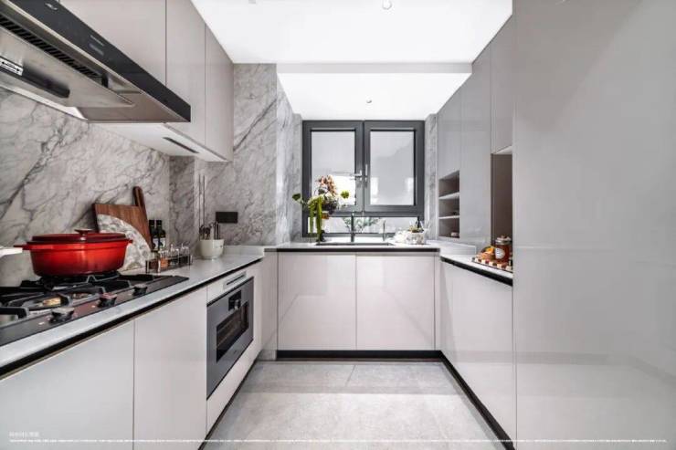 在豪宅的配置之外,精装细节亦追求极致:公共区域选用80×80cm的大理石通铺,以整面石材的厚重质感彰显空间格调,同时采用无缝拼接工艺,显著降低了日常清洁的难度。