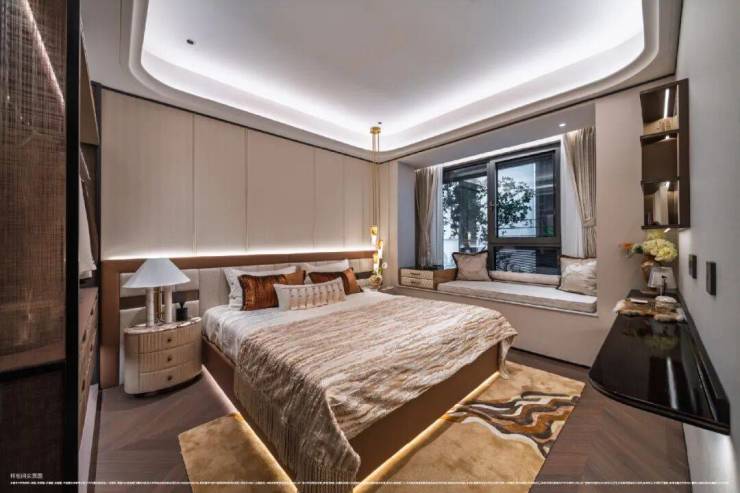 卧室则铺设海派鱼骨拼花地板,借木质肌理的温润与细腻,营造出私密领域的宁静氛围。这种“公区显质感、私域藏温度”的材质分区逻辑,恰是高端住宅设计中至关重要的一笔。