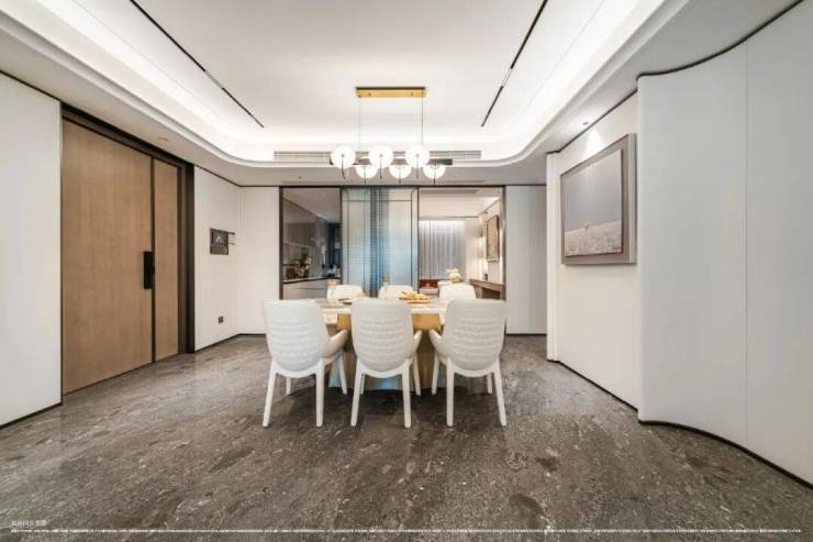 客餐厅一体化,外接南向大面积观景阳台,整个公区视野开阔,尺度阔绰。