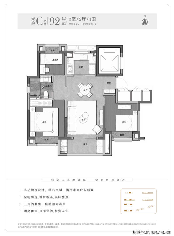 另外这个户型能更好实现 南北通透,客厅-餐厅-阳台-厨房一线连通。