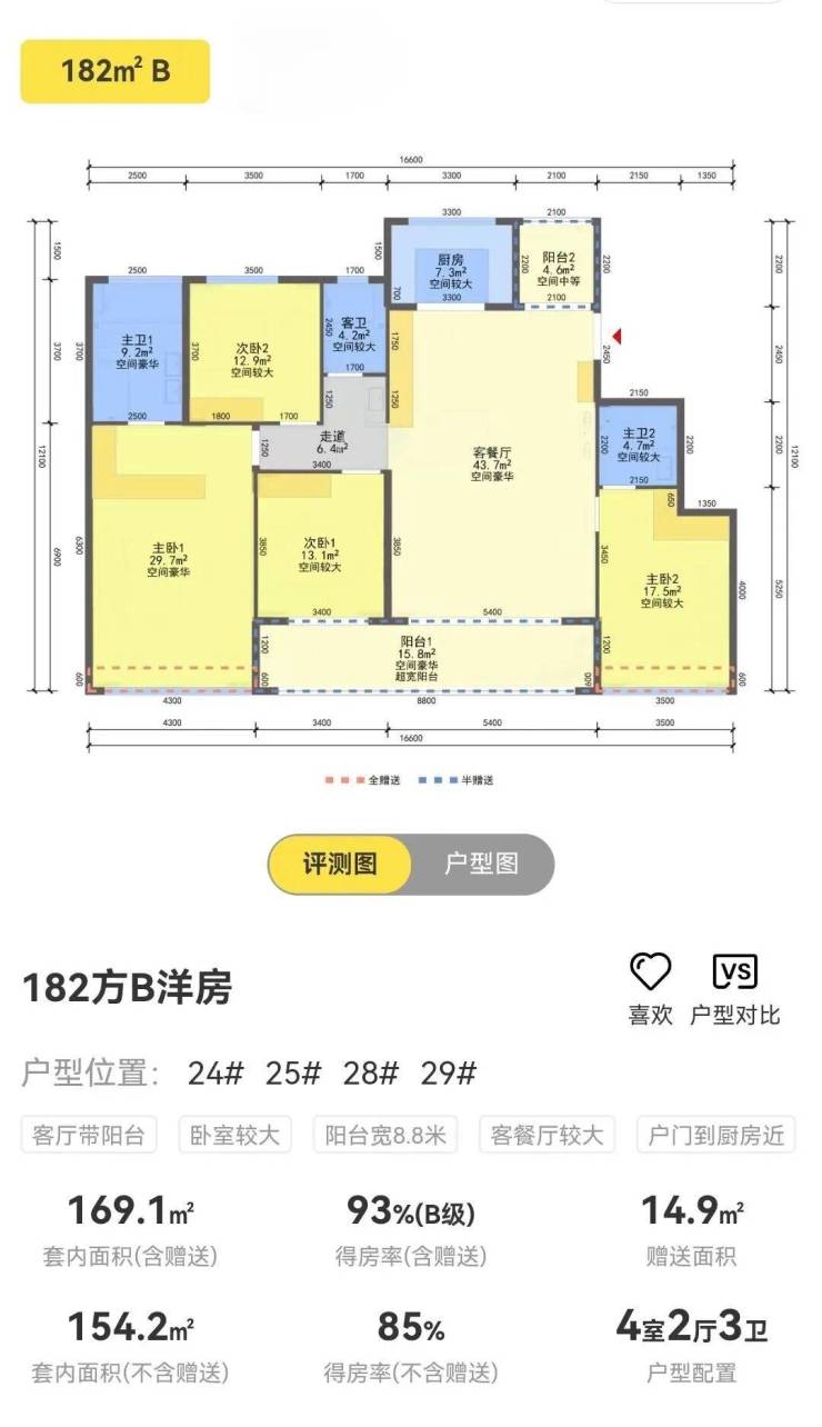 得房率 :166㎡含赠送得房率95%,182㎡含赠送得房率93%