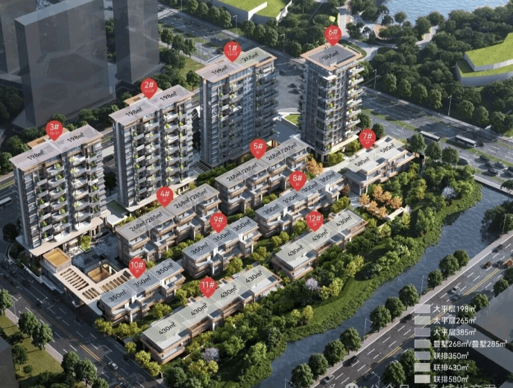 项目由四代宅高层、叠墅、联排组成。高层198㎡、265㎡,一层一户385㎡。叠墅,267㎡(下叠)、276㎡(上叠),带私家电梯、花园/露台。联排350/420㎡,双拼580㎡。高层精装,叠墅/别墅毛坯。