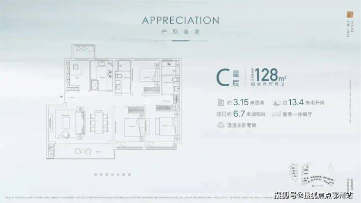四开间朝南的设计,南向面宽约13.4米,整个户型方正气派