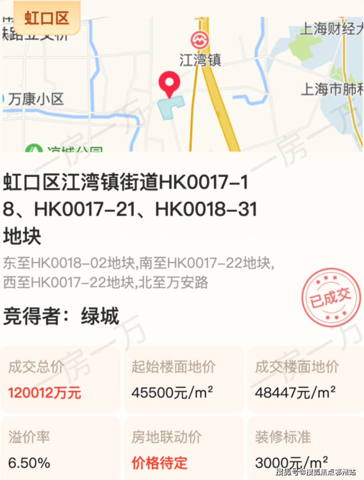其中, 虹口江湾地块容积率2.25-2.5,溢价率6.48%,楼板价48447元/㎡,装修标准不低于3000元/㎡。