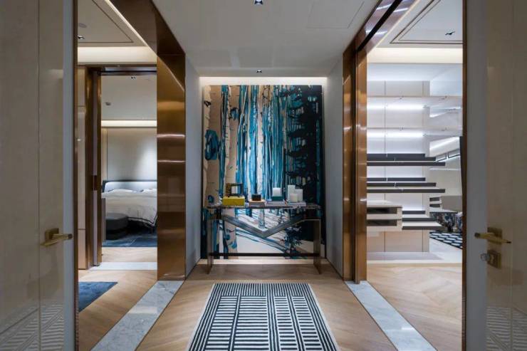 这里有18000元/㎡的装标,有从瑞士V-ZUG、德国汉斯格雅、唯宝到伯格曼的全进口厨卫,有从墙上的雀眼木、软硬包到地上卡拉拉白大理石的铺装,连公区装标都高达2万/㎡,电梯厅全石材铺装,楼层公区选用与深圳湾一号同款的阿曼玫瑰石材。