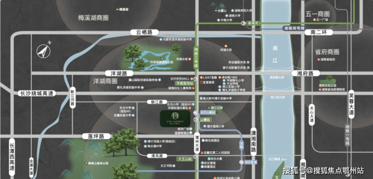 直线距离约850米直达湘江沿江风光带,近邻约6000亩洋湖国家湿地公园、约1200亩巴溪洲公园、约3800亩大王山森林公园、约7100亩伏龙山、约2000亩狮峰山,城市与自然随心切换。