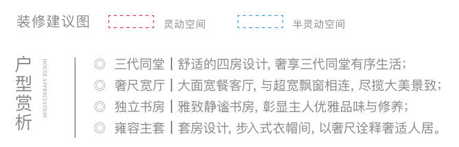 该户型 奢适四房设计,拥南向阳光双卧、北向次卧和书房, 一家三代同室而居,也能从容生活,尽享天伦之乐。