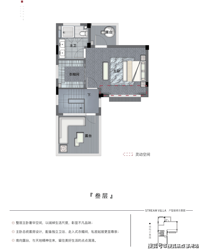 三层整层主卧套房设计,配备独立衣帽间和超大卫浴,私密又尊贵。 南北双露台,俨然就是空中大花园,养花饲草,运动健身,烧烤聚会,观星冥想,生活的小确幸都可在此完成。