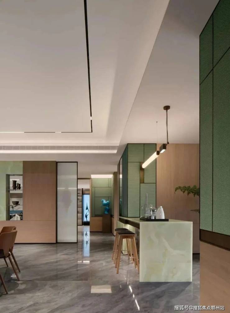 除了设计上的匠心灵感,也有源于大自然的古朴本真。为塑造更具美感的室内公区空间,CCD从众多石材中精心挑选芬迪白大理石,瑰丽柔和的纹路,点睛整片空间。由特色普拉达绿雕琢而成的独立岛台,经过二次切割再打磨,材料损耗度较高,其独特的圆弧造型,只为呈现尊贵品质与更多样体验的可能。