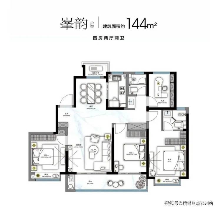 对尺度更有要求的改善家庭,也可以关注一下建面约144㎡户型, 做到四开间朝南,入户就是开阔明媚的大客厅 ,连通着 双开间大阳台 ,任由阳光洒落,尽瞰园林盎然,餐厅全明带窗户,靠近厨房,缩短做餐动线,朝南的房间, 配备了全尺寸飘窗,主卧更带独立衣帽间和卫浴 ,私密性十足。