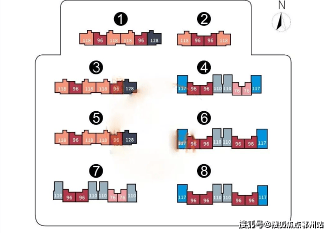 1、3号楼为21层、2个单元、2梯3户结构;2号楼为21层、1个单元,2梯4户结构,包含建面约96-128平房源。