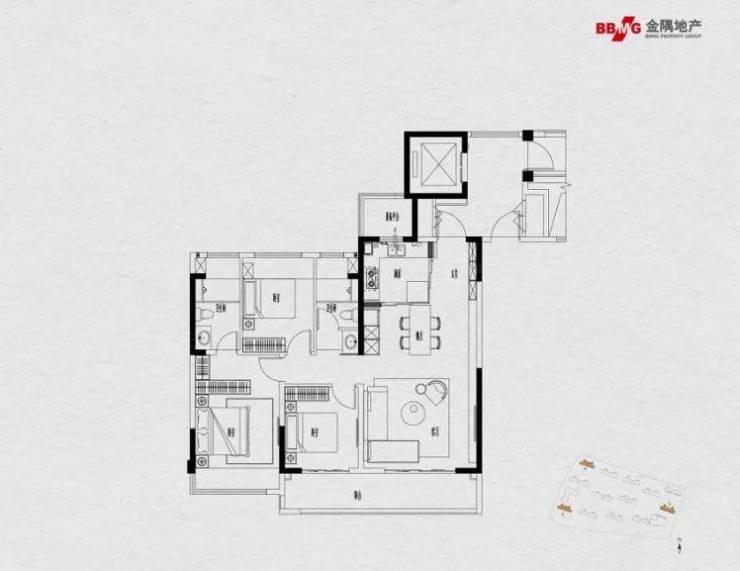 143㎡户型, 南北通透、餐客一体、全明双卫、超大飘窗,视野、尺度一应俱全。